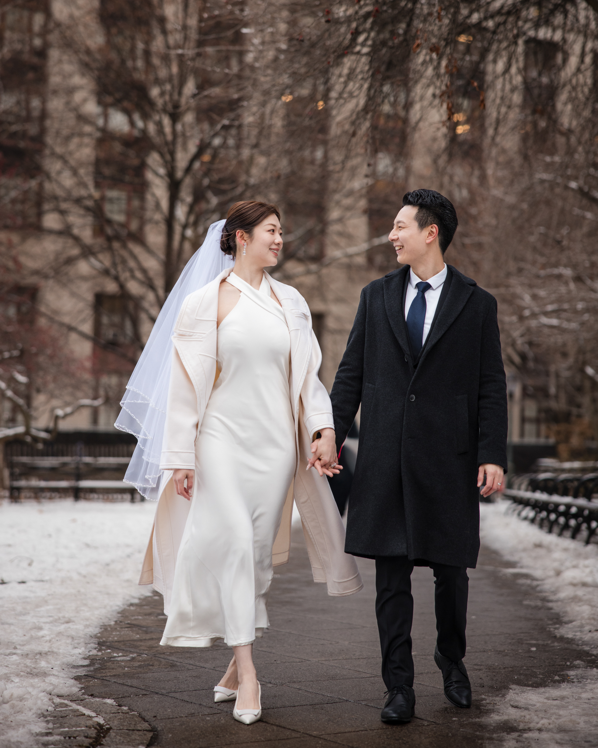A bride and groom walk hand in hand outside on a snowy day, both smiling and dressed in formal wedding attire after taking City Hall subway station wedding photos.