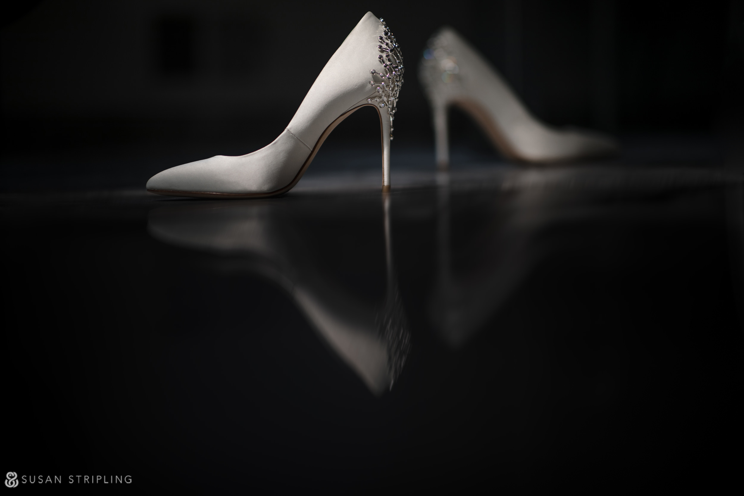 A pair of high heeled wedding shoes on a table at Florentine Gardens estate.