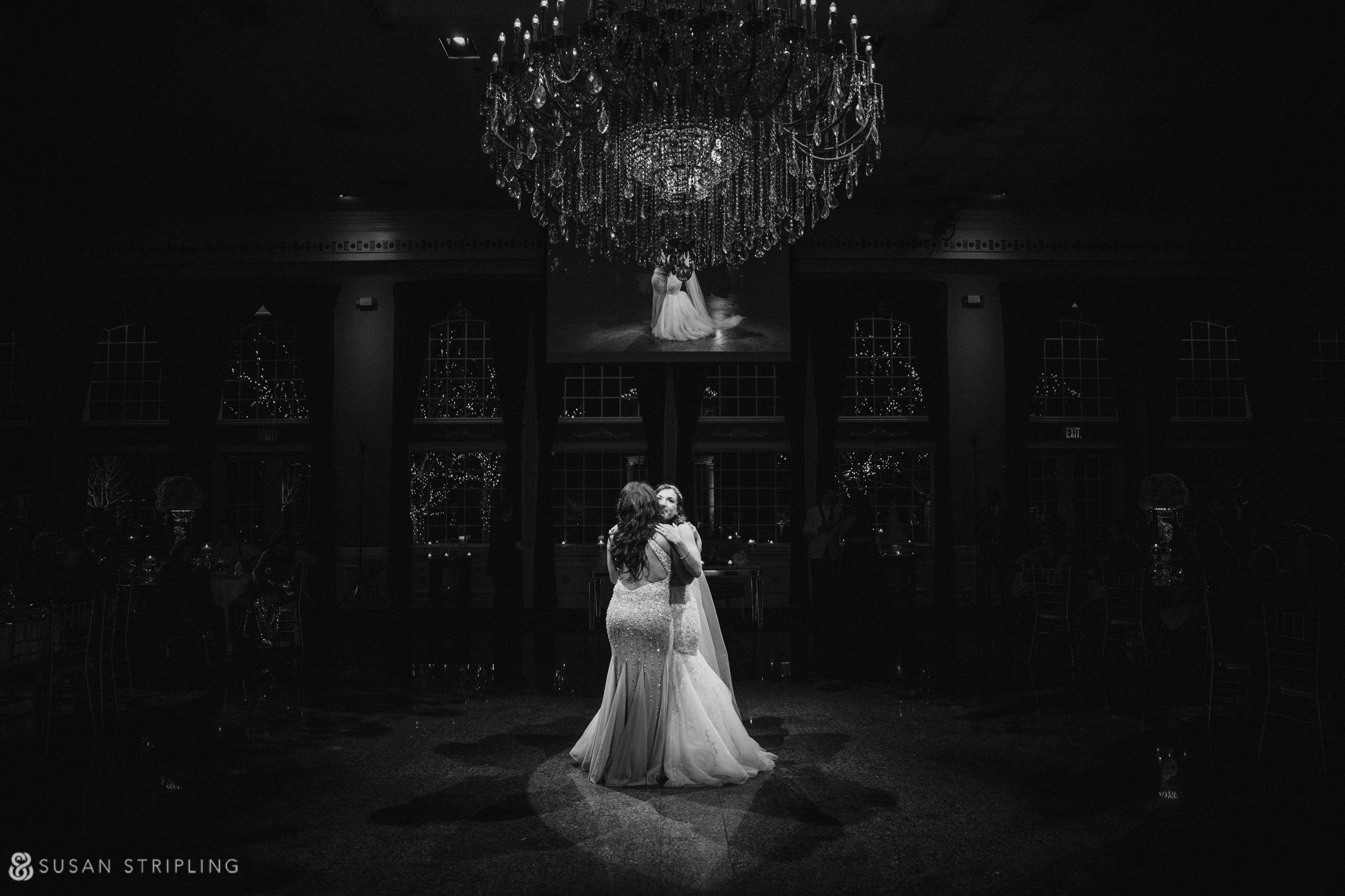 A bride and groom standing in front of a chandelier at the Florentine Gardens Wedding estate.