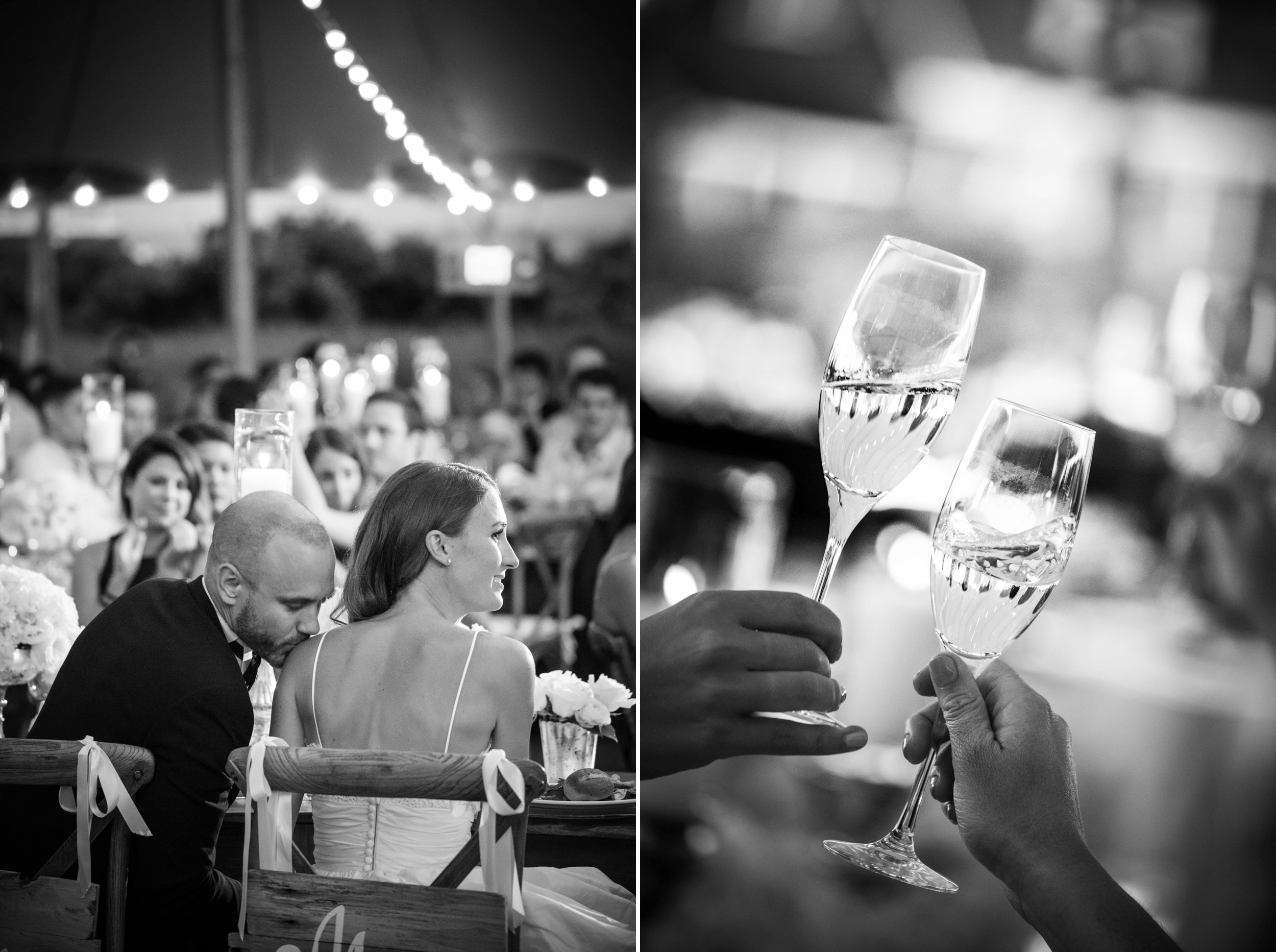Black and white split-image: on the left, a couple at an ocean house Rhode Island wedding ceremony, and on the right, a close-up of a toast with two clinking glasses.