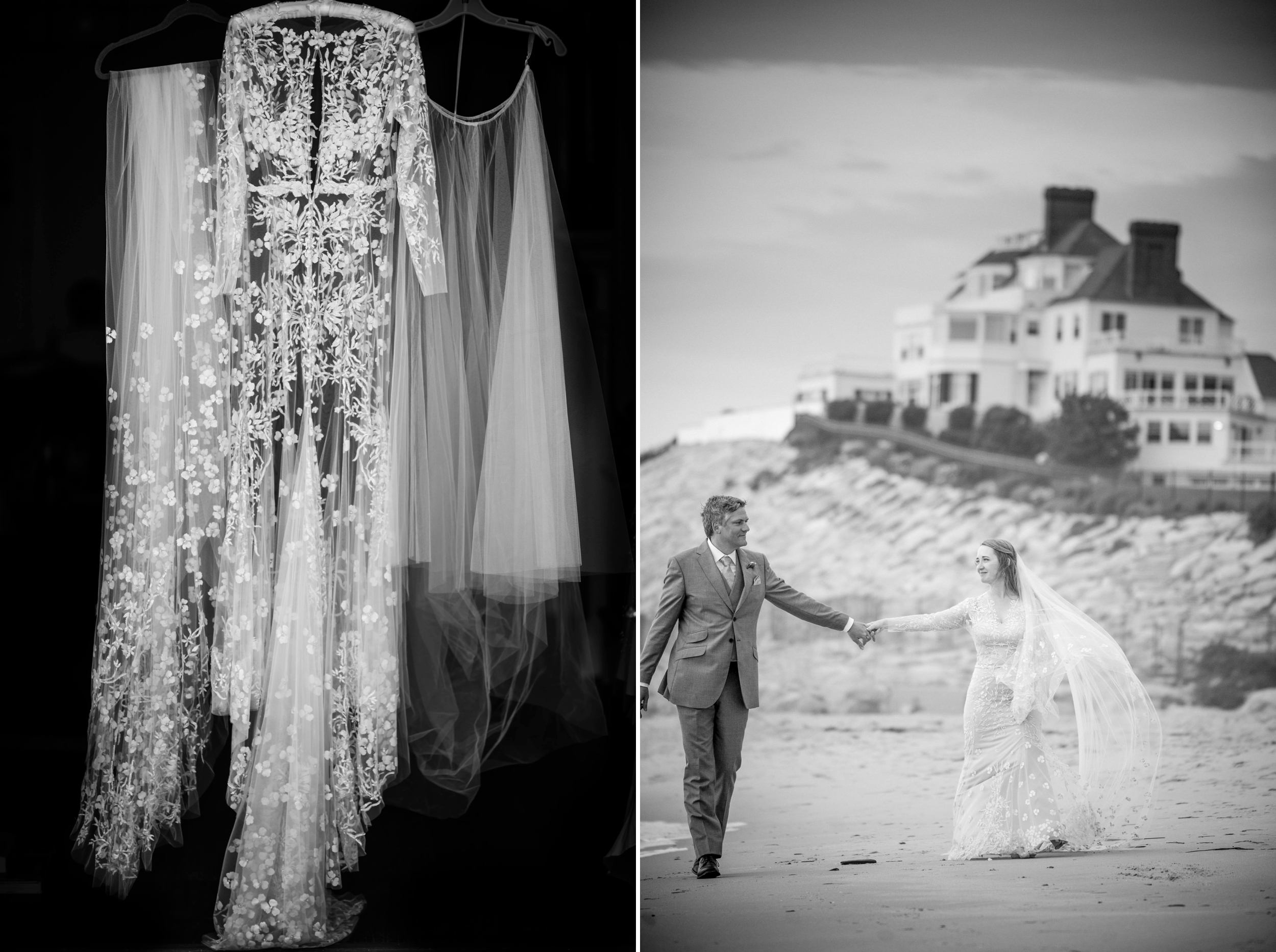 A delicately embellished wedding dress hangs on display, while a black and white photo shows a bride and groom holding hands on a beach with the grand Ocean House in Rhode Island in the background.
