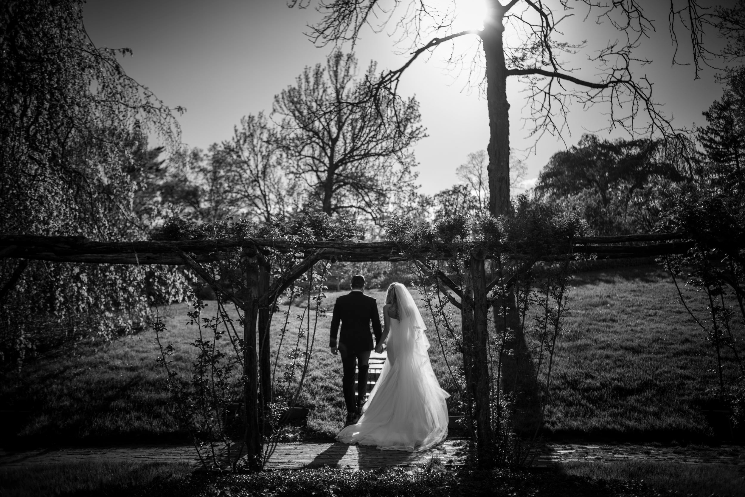 Newlyweds walking hand in hand under a pergola in a sunlit garden at Old Westbury Gardens.