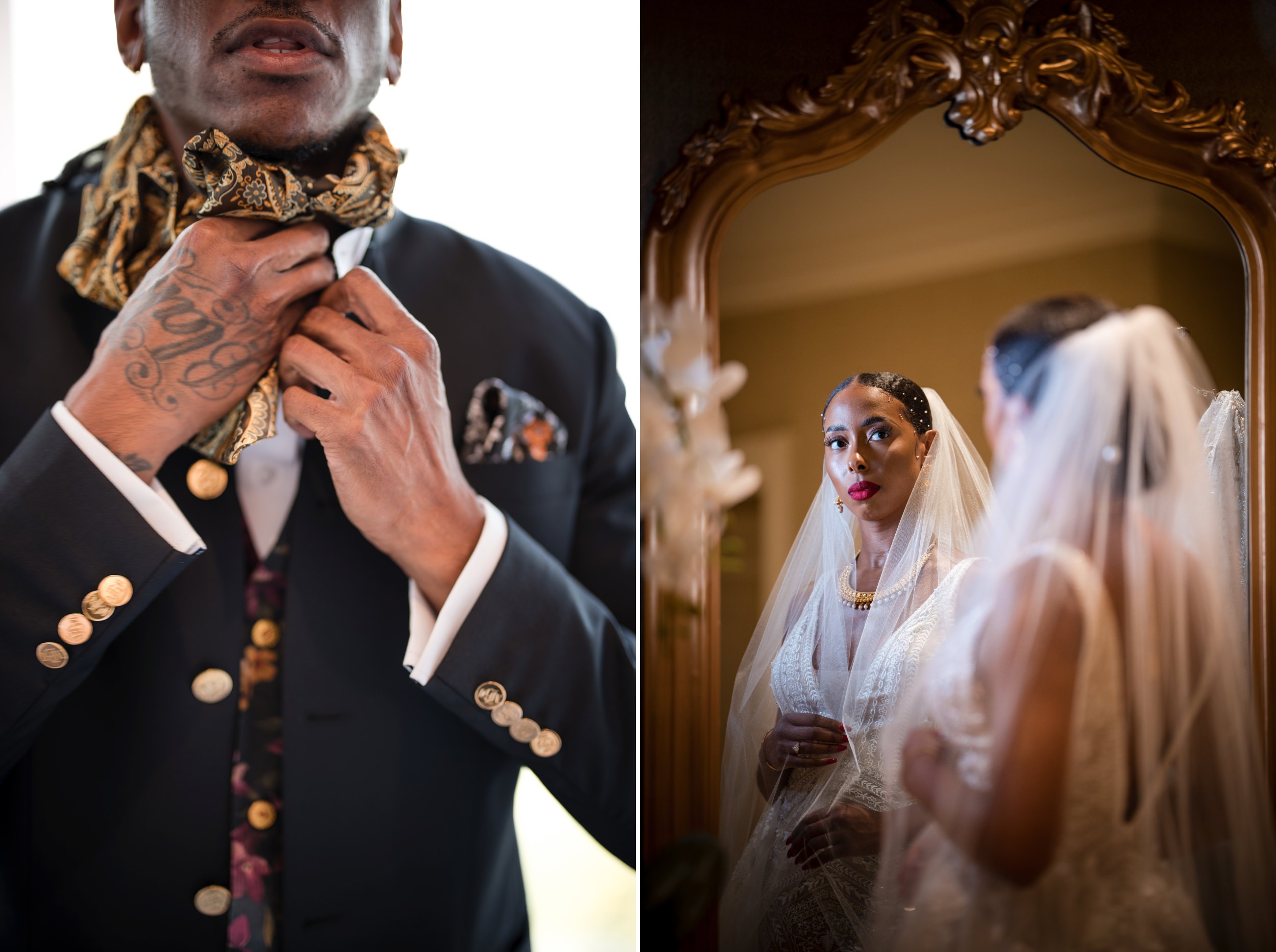 A diptych of wedding scenes at The Mansion on Main Street: on the left, a man adjusts his bow tie; on the right, a bride looks at her reflection in a mirror.