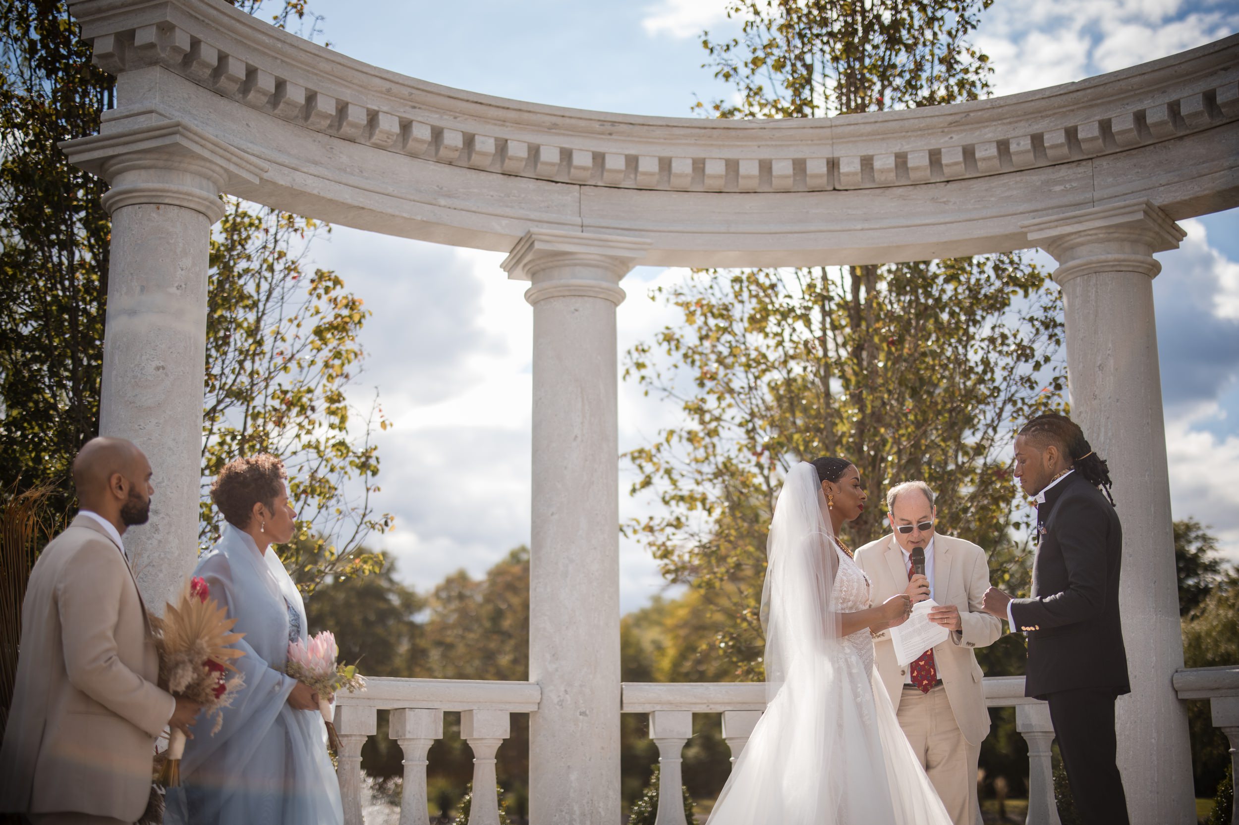 A wedding ceremony with a bride and groom exchanging vows under a white, classical arch at The Mansion on Main Street, surrounded by a small group of attendees on a sunny day.