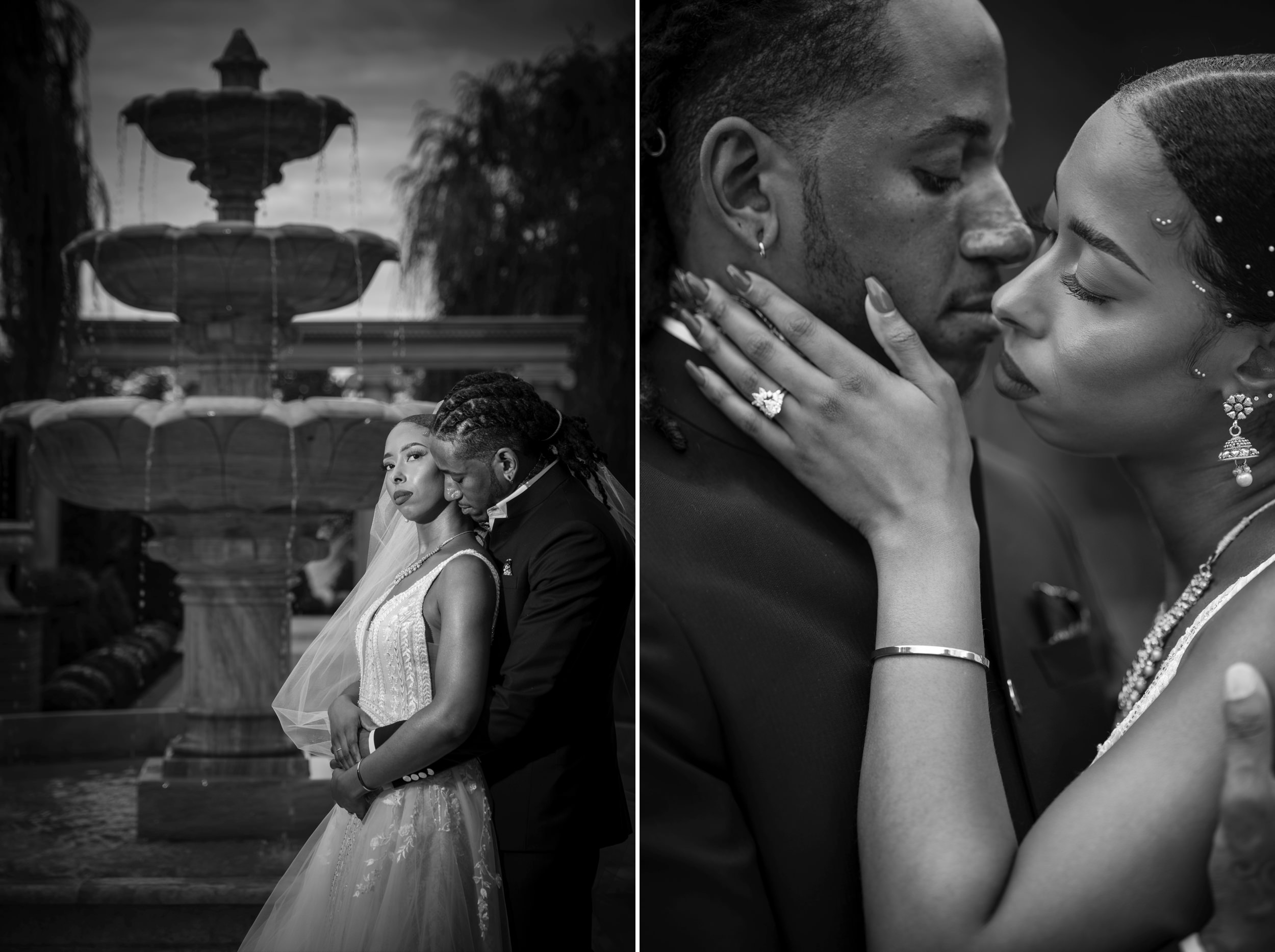 Black and white photo of a bride and groom at The Mansion on Main Street wedding, posing romantically beside a fountain and close-up of their intimate moment, touching foreheads.