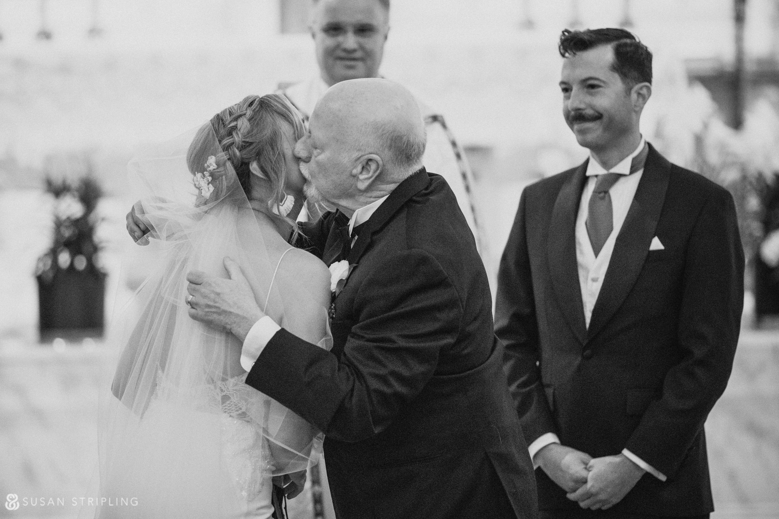 A bride kisses her father during a wedding ceremony at Loews Hotel Philly.