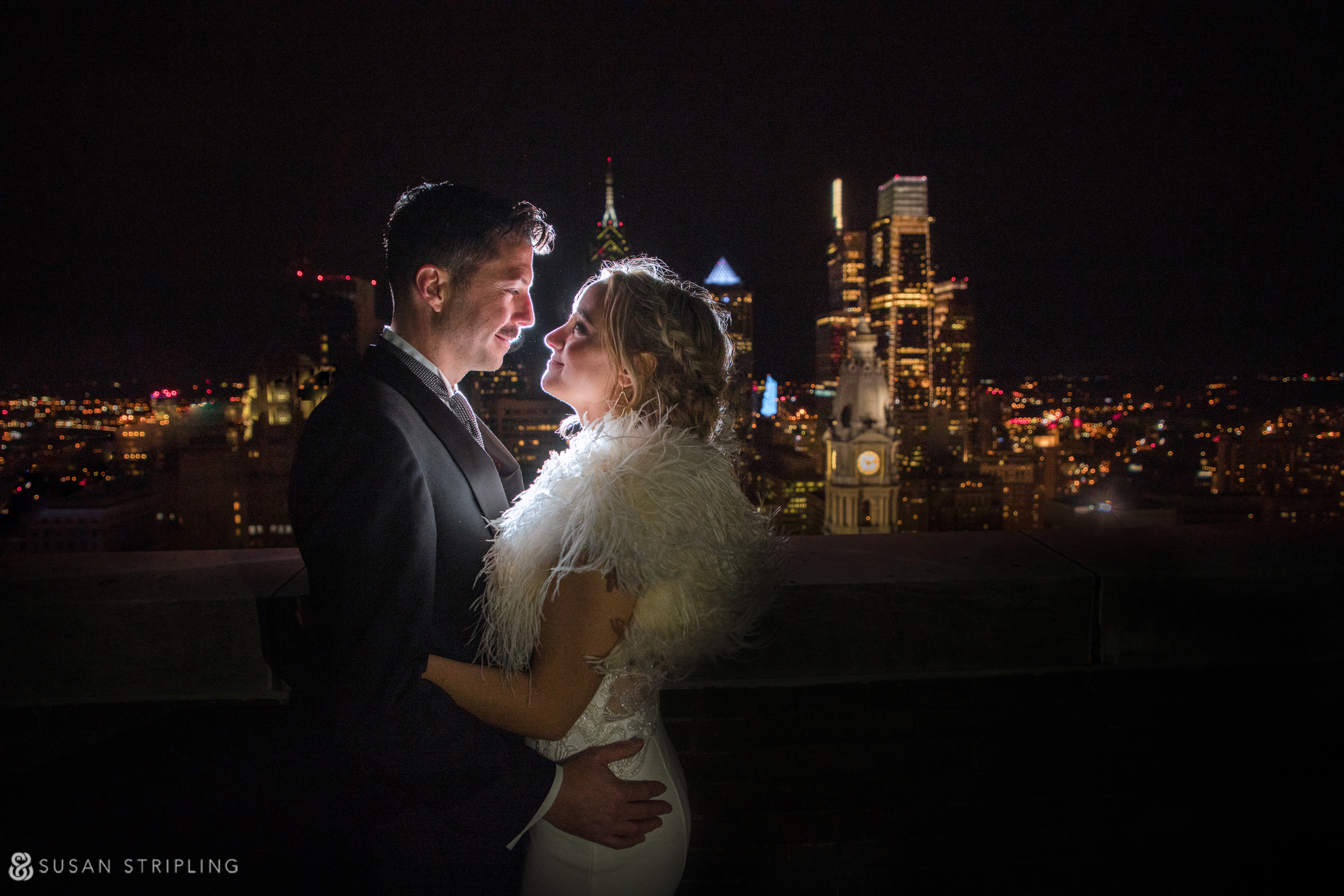A wedding couple embracing in front of a city skyline at night at Loews Hotel Philly.