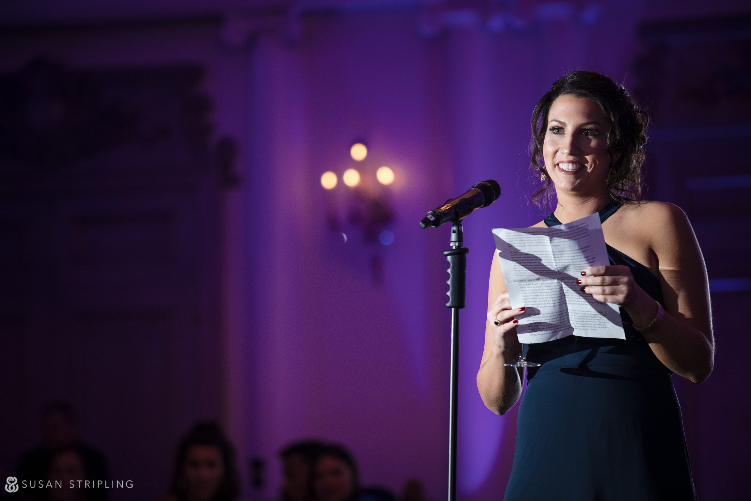 A woman is holding a piece of paper while speaking into a microphone at Park Chateau wedding.